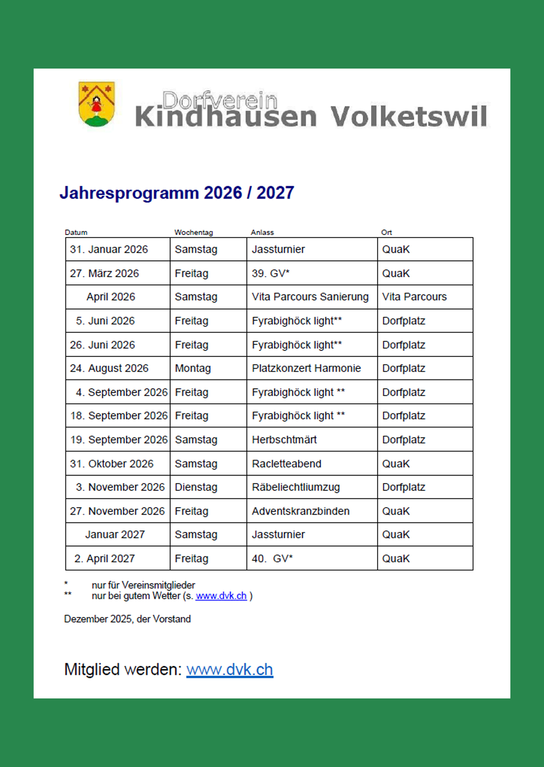 Der Dorfverein organisiert resp. betreut verteilt übers Jahr eine Vielzahl von Anlässen. Sie reichen von kulturell bis sportlich und richten sich teilweise an die Vereinsmitglieder, teils aber auch an die gesamte Einwohnerschaft unseres Dorfes. Im Zentrum steht die Begegnung und das gesellige Beisammensein im Rahmen verschiedenartiger Aktivitäten. Wir freuen uns darauf, auch Sie möglichst oft bei unseren Anlässen zu begrüssen.